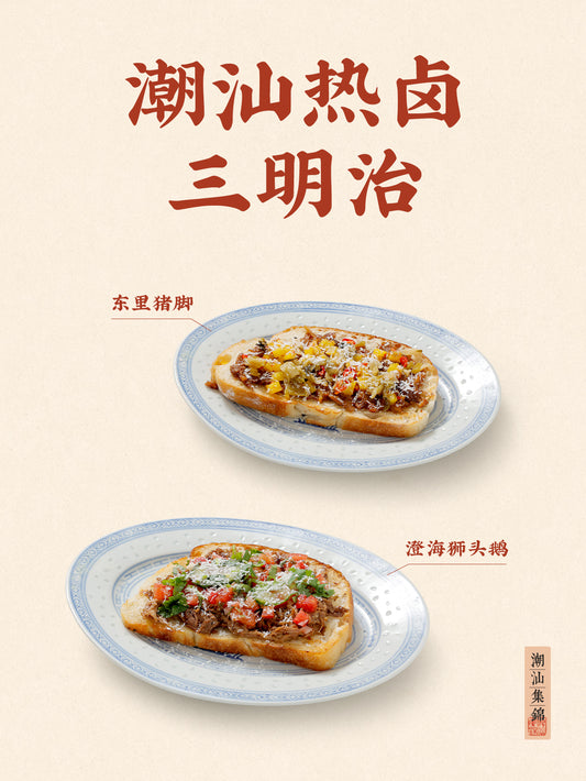 潮汕的两碗快乐饭——东里猪脚、澄海狮头鹅饭,这次我们做成三明治,搭配经典的炒酸菜、潮汕奶酪牛铃、金不换……2款口味等你解锁。