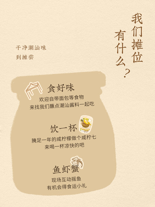 作为一个线上渠道为主的品牌,我们一直很希望能多多到线下,为此我们捣鼓了一个计划「出摊远门」,带着酱料出远门,到各个城市的市集移动摆摊,和朋友们面对面,聊聊喜爱的料理、喜欢的潮汕味道……