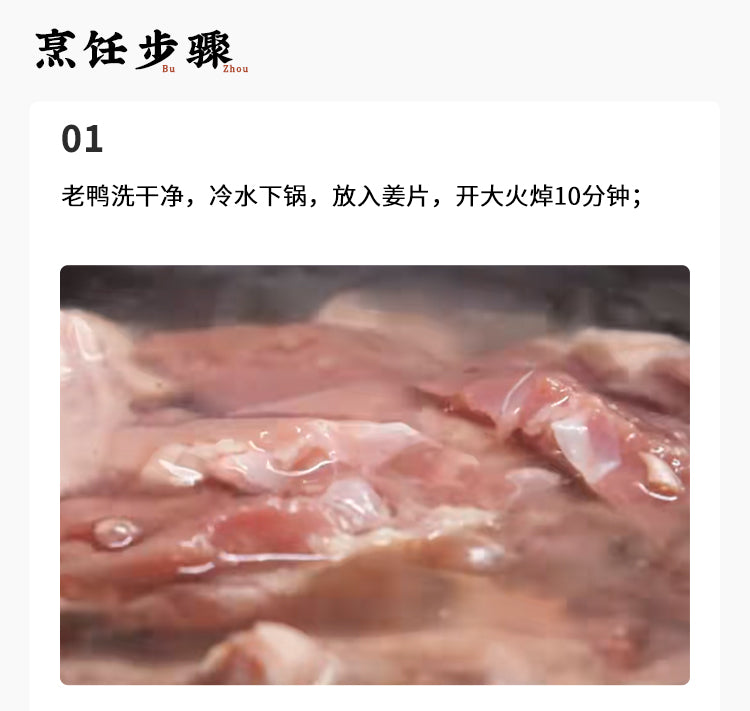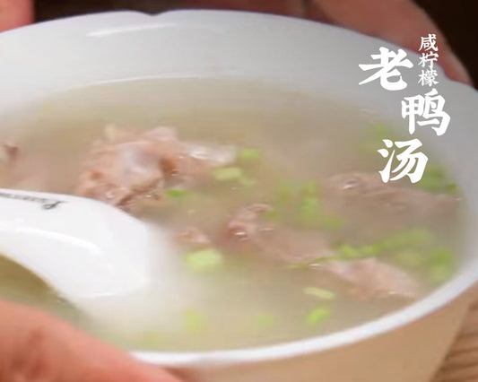 预计烹饪时长:60分钟 / 食材数量:5种【食谱食材】半只 老鸭适量 姜片1颗 咸柠檬适量 清水适量 芹菜粒【烹饪步骤】1.老鸭洗干净,冷水下锅,放入姜片,开大火焯10分钟;2.咸柠檬对半切开,去囊去籽(去除苦味);3.砂锅倒入清水,倒入焯透的鸭肉,开中火,加盖炖煮30分钟;加入咸柠檬,加盖继续炖煮10分钟,开盖撒上芹菜粒就即可。