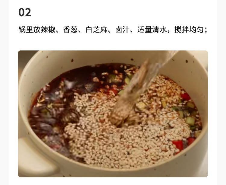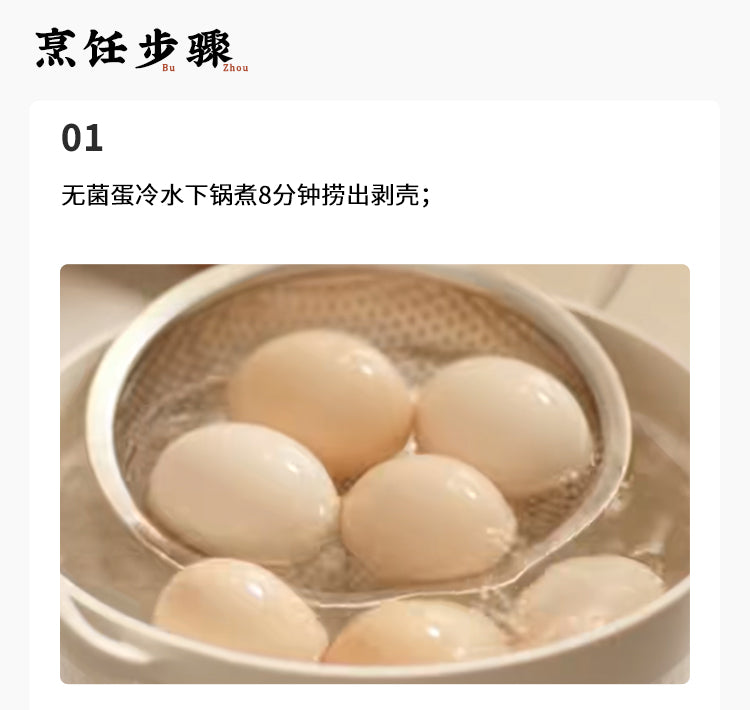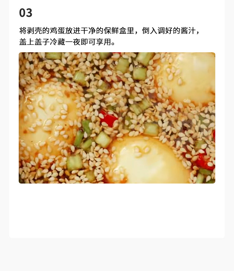 預計烹飪時長:10分鐘 / 食材數量:6種【食譜食材】6個 無菌蛋適量 辣椒適量 香蔥適量 白芝麻適量 清水1包 鹵汁【烹飪步驟】1.無菌蛋冷水下鍋煮8分鐘撈出剝殼;2.鍋裏放辣椒、香蔥、白芝麻、鹵汁、適量清水,攪拌均勻;3.將剝殼的雞蛋放進幹凈的保鮮盒裏,倒入調好的醬汁,蓋上蓋子冷藏一夜即可享用。