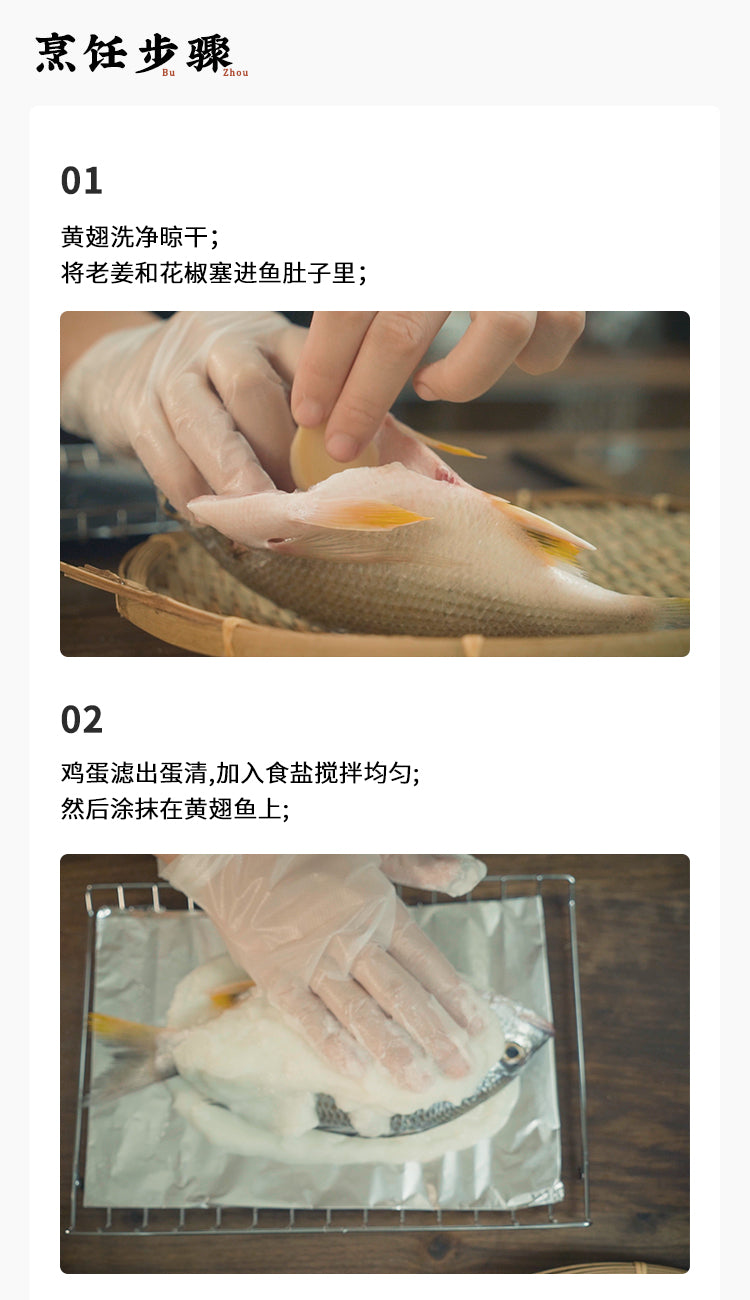 預計烹飪時長:35分鐘 / 食材數量:6種【食譜食材】1條 黃刺4個 雞蛋1包 鹽巴少許 姜少許 花椒少許 普宁豆醬【烹飪步驟】1.黃翅洗凈晾幹;將老姜和花椒塞進魚肚子裏;2.雞蛋濾出蛋清,加入食鹽攪拌均勻;然後塗抹在黃翅魚上;3.打開烤箱將黃翅放入;溫度設置200火烤30分鐘即可;