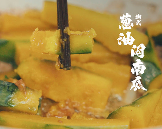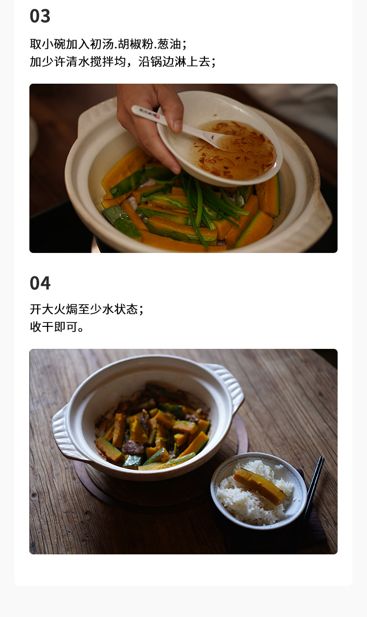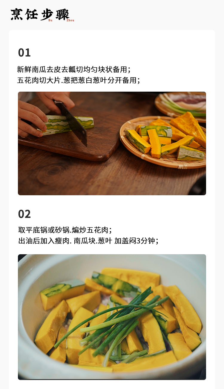 【烹飪步驟】1.新鮮南瓜去皮去瓤切均勻塊狀備用;五花肉切大片.蔥把蔥白蔥葉分開備用;2.取平底鍋或砂鍋,煸炒五花肉;出油後加入瘦肉、南瓜塊、蔥葉加蓋悶3分鐘;3.取小碗加入初湯、胡椒粉、蔥油;加少許清水攪拌均,沿鍋邊淋上去;4.開大火焗至少水狀態;收幹即可。